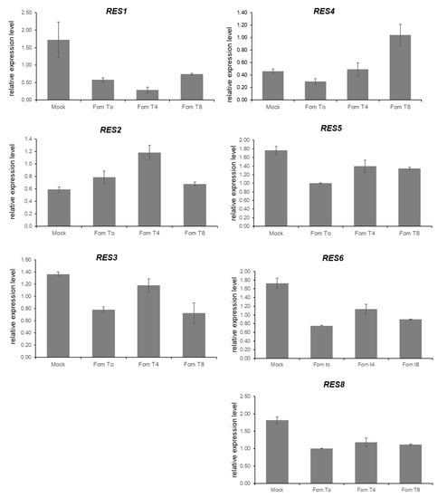 Primers for qRT-PCR were developed on the consensus-predicted CDS sequence (Table 1) of the 10 genes (RES1-RES10) with the highest match with the S. aethiopicum transcript. For 7 out of 10 candidate genes (RES1, RES2, RES3, RES4, RES5, RES6 and RES8), preliminary expression data through real-time qPCR analysis was successfully obtained in ‘305E40’ cDNA samples of roots at different timepoints after inoculation with Fom, while about the other three genes (RES7, RES9, RES10) RT-qPCR always led to multiple peaks in melting or was not reliable at all. These 7 genes (RES1, RES2, RES3, RES4, RES5, RES6 and RES8) are all expressed at T0 both in Fom- and mock-inoculated roots (Figure 7) and their expression at different time points in response to fungal inoculation is described in Figure 7.