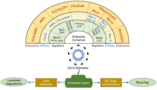 - Thottacherry, J.J.; Sathe, M.; Prabhakara, C.; Mayor, S. Spoiled for choice: Diverse endocytic pathways function at the cell surface. Annu. Rev. Cell Dev. Biol. 2019, 35, 55–84. [Google Scholar] [CrossRef]