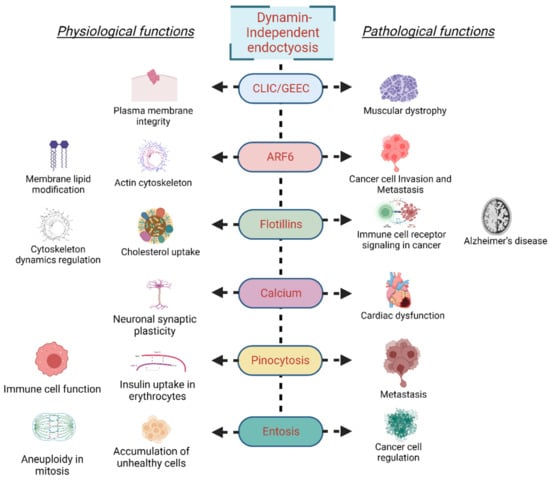 Dynamin-independent endocytosis mechanisms are widely implied to regulate physiological functions and pathological processes. Several nutrients and cellular components are internalized through endocytosis and affect cellular physiology. For example, Arf6-mediated endocytosis is crucial for nutrient and ion transport, cell–cell interactions (Glut1, potassium channels, mucolipin-2, CD98, and CD147), and immunological functions (MHCI, Cd1a, and MHCII) [116]. Folate receptor endocytosis by Cdc42 is essential for nutrient balance [30]. Maintaining plasma membrane tension is vital for various cellular processes, and CG endocytosis is implied in maintaining it . Non-dynamin GTPases (such as Rac1 and RhoA) regulate cell polarity and transcytosis of essential proteins [117,118,119]. It is noteworthy that the endosomal system plays a role in initiating and propagating intraneuronal signaling events and guides axonal growth, dendritic branching, and survival efforts [120]. Furthermore, neurotrophin-stimulated tyrosine receptor kinase (TRK) endocytosis is mediated by macropinocytosis and ensures proper intraneuronal signaling cascades [121]. Dynamin-dependent endocytosis has also been linked to the pathogenesis of several diseases. For instance, a vast number of endocytic proteins in nasal epithelial cells favor the entry of SARS-CoV-2 [122]. Several theories have linked the dysregulated endocytic process with early-stage cancers (disruption of cell–cell junctions and loss of morphological polarity) [123]. The dynamin-independent endocytosis is involved in modulating cell signaling and migration linked with the pathogenesis of several diseases, including cancer and autoimmune disorders [124,125]. Together, these studies signify the pathophysiological role of dynamin-independent endocytic mechanisms.