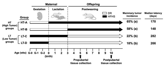Animal model. Mice were exposed to either a DR or a HFHS diet during three developmental stages: gestation, lactation, and postweaning. Gestational and lactational diets refer to the diets delivered to the mothers. After 3 weeks of age, the pups were weaned and were maintained on the postweaning diet until death. HT-A: DR/HFHS/HFHS; HT-B: DR/DR/HFHS; LT-C: HFHS/HFHS/DR and LT-D: HFHS/DR/DR. DR: non-obesogenic, low-fat, low-sugar, and mildly restricted diet; HFHS: high-fat and high-sugar diet. Pearson’s chi-squared test was used to compare mammary tumor incidence: a ≠ b, p < 0.03, Ref. [8].
