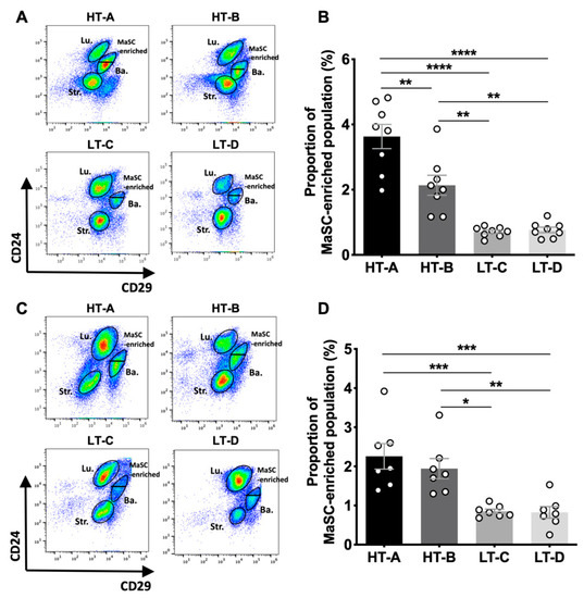 Since we aimed to investigate the effect of early dietary exposures on the mammary gland, we collected tissues from 5-week and 10-week-old mice that were not treated with carcinogen (Figure 1). To assess the effect of the dietary regimens on mammary stem cell (MaSC) numbers, we performed fluorescence-activated cell sorting (FACS) analyses of mammary epithelial cells (MECs). The MaSC-enriched population was identified by previously validated cell surface markers (Lin−/CD24med/CD29hi) [28,29] and the gating strategy is shown in Supplemental Figure S1A. In mammary tissues from prepubertal mice, the MaSC-enriched population from group HT-A was 3.5-times higher than in groups LT-C and LT-D (Figure 2A,B). Similarly, the MaSC-enriched population from group HT-B was 2.6 times higher than both LT groups (Figure 2A,B). In postpubertal animals, the MaSC-enriched population from both HT groups was still increased by 2.0 times compared to the LT groups (Figure 2C,D). These results indicate that exposure to the HT-A and HT-B dietary regimens expanded the MaSC-enriched compartment before puberty, and this expansion was maintained postpubertally.