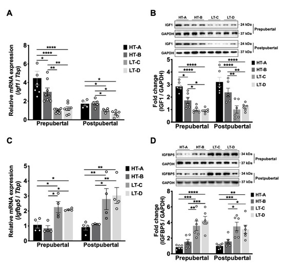 The bioavailability of Igf1 in the mammary gland is regulated by Igf-binding proteins (Igfbps) [34,35]. Igfbps consist of six protein members (Igfbp1-6), of which Igfbp5 has been shown to play critical roles in regulating the proliferation, apoptosis, and differentiation of MECs [34]. Igfbps can inhibit Igf1 signaling by sequestering free Igf1, reducing its binding to the Igf1 receptor (Igf1r) [35]. Our data show that Igfbp5 mRNA and protein levels were significantly decreased in mammary glands from HT compared to LT groups at both pre- and postpubertal stages (Figure 4C,D). These findings indicate that the HT-A and HT-B dietary regimens not only increased total mammary Igf1 expression levels, but also increased Igf1 bioavailability through the downregulation of Igfbp5.