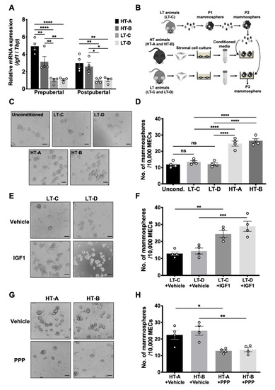 The HT-A and HT-B dietary regimens increased Igf1 production in mammary stromal cells and promoted MaSC self-renewal. (A) Igf1 mRNA levels in FACS-sorted mammary stromal cells from 5-week-old and 10-week-old tissues from the HT and LT groups (n = 4/group). Relative Igf1 mRNA levels are expressed as fold change over group LT-C; (B) Experimental procedure of the mammosphere assay using stromal cell-conditioned medium (CM); (C) Representative images and (D) bar graph showing numbers of mammospheres formed in CM produced by HT and LT groups. Unconditioned DMEM/Ham’s F-12 medium was used as a control; (E) Representative images and (F) bar graph showing numbers of mammospheres formed in LT-C-CM and LT-D-CM, supplemented with DMSO vehicle or 7.5 nM recombinant Igf1; (G) Representative images; (H) Bar graph showing numbers of mammospheres formed in HT-A-CM and HT-B-CM, supplemented with DMSO vehicle or 10 μM picropodophyllin (PPP). Scale bar of images = 100 µm. Four independent experiments (n = 4) were performed, and circles in the bar graphs represent individual data points collected from independent experiments. Mean ± SEM is shown. One-way ANOVA was used for statistical analysis, and pairwise comparisons were performed using Tukey’s posttest. * p < 0.05, ** p < 0.01, *** p < 0.001, **** p < 0.0001; ns, not significant.