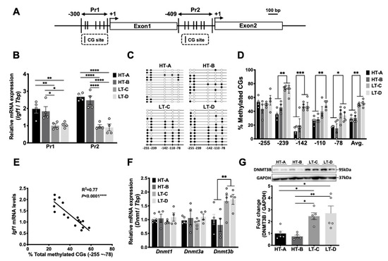 The QPCR analysis of FACS-sorted mammary stromal cells showed that both Pr1 and Pr2 transcripts were expressed at significantly higher levels in 5-week-old, prepubertal mice in HT groups compared to age-matched LT animals (Figure 6B). To examine whether this increase in Igf1 transcription was due to hypomethylation of one or both promoters, we performed bisulfite sequencing analyses to study methylation patterns of the CG sites that flank the Pr1 and Pr2 promoter transcription start sites (TSS) (Figure 6A). Figure 6C,D show that Pr1 was hypomethylated in mammary stromal cells from prepubertal HT animals on four out of five CG sites, compared to the LT animals. Of the CG sites, 41.0% of CG-239 were methylated in the HT groups, compared to 72.0% of CG-239 in the LT groups; 15.5% of CG-142 in HT groups vs. 48.5% of CG-142 in LT groups; 27.5% of CG-110 in HT groups vs. 44.5% of CG-110 in LT groups; 16.5% of CG-78 in HT groups vs. 35% of CG-78 in LT groups (Figure 6D). Igf1 Pr1 mRNA levels in each stromal cell sample were inversely correlated with the total DNA methylation percentages of the five Pr1 CG sites (Figure 6E, R2 = 0.77, p < 0.0001). These results indicate that the HT-A and HT-B dietary regimens increased Igf1 expression in mammary stromal cells by inducing DNA hypomethylation of the Pr1 promoter.