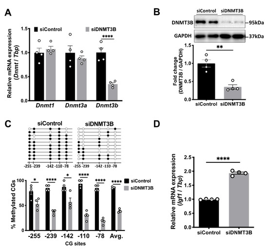 3.6. Dnmt3b Knockdown Decreased Igf1 Pr1 DNA Methylation and Increased Igf1 mRNA Expression