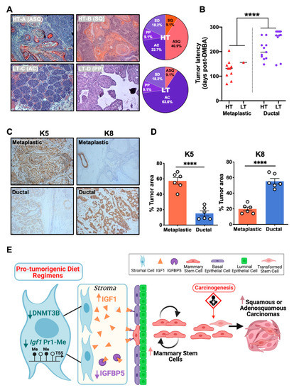 DMBA-treated animals receiving the HT-A and HT-B dietary regimens developed increased proportions of metaplastic carcinomas. (A) Representative hematoxylin and eosin images (magnification = 10X) and distribution of tumor histopathological types in the HT (n = 22) and LT (n = 11) groups. ASQ, adenosquamous carcinoma; SQ, squamous carcinoma; AC, acinar carcinoma; PP, papillary carcinoma; SD, solid carcinoma; (B) Tumor latency of metaplastic carcinomas (n = 12) and ductal adenocarcinomas (n = 21) in the HT and LT groups. Latency analysis was performed with the Kaplan–Meier method, and statistical significance was determined with the log-rank test. **** p < 0.0001; (C) Representative images of immunohistochemical staining of metaplastic carcinomas and ductal adenocarcinomas. Left panel, K5; right panel, K8 staining; (D) Quantification of K5 (left panel) and K8 (right panel) expression in mammary tumors (n = 7). Student’s t-test, **** p < 0.0001; (E) Proposed model of mechanisms by which the HT-A and HT-B dietary regimens increase mammary tumor susceptibility.