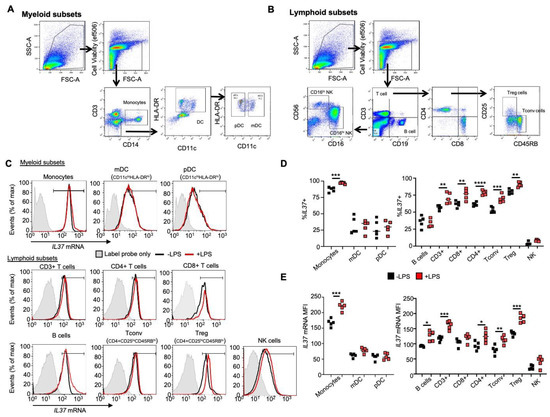 Identification of IL37-expressing cells in human PBMCs using a flow cytometry-based PrimeFlow® RNA assay. (A,B) Myeloid (A) and lymphoid cell (B) gating strategy analyzing the expression of cell surface proteins and IL37 mRNA from immune cells. (C–E) Histogram (C) and quantification by frequency (D) and mean fluorescent intensity (MFI) (E) of IL37 mRNA expression in myeloid and lymphoid cell subsets. PBMCs were treated in the absence (-), black lines or black symbols) or presence (+, red lines or red symbols) of 100 ng/mL LPS for 24 h. A gray histogram represents the fluorescence of the label probe only (background) for each immune cell subset as a negative control. Gating for determining positive cell frequency was established to exclude ~99% of the control events as negative. RPL13a mRNA served as an internal control (not shown). Each symbol represents an individual donor; small horizontal lines indicate mean ± s.e.m., (n = 5 donors per group) (A–E). * p < 0.05; ** p < 0.01; *** p < 0.001; **** p < 0.001 (Student’s t-test). Data are representative of two independent experiments.