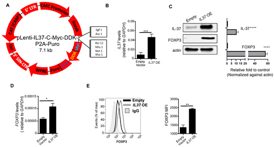 To develop a stable cell line expressing IL-37, we generated a lentiviral FLAG-tag IL37 overexpressing vector (vector shown in Figure 2A). To measure IL37 mRNA, we employed qRT-PCR using the same primer sets used for the PrimeFlow® RNA assay. Human leukemia E6 Jurkat cells and their empty vector-transduced cells express very little IL-37 at both the gene (Figure 2B) and protein (Figure 2C) levels, making them suitable for studying IL-37-induced changes. When FLAG-tag IL37 was transduced, the Jurkat cells overexpressed IL-37 at the gene (~5.8-fold increase) and protein (~9.2-fold increase) levels, confirming successful transduction and translation, respectively (Figure 2B,C). IL37 overexpressing (OE) Jurkat cells had elevated FOXP3 gene expression compared to control Jurkat cells (Figure 2D), which was further confirmed at the protein levels by Western blotting (Figure 2C) and flow cytometry (Figure 2E). Specifically, FOXP3 densitometry measurements showed a 78-fold increase in FOXP3 protein expression in IL37 OE Jurkat cells.