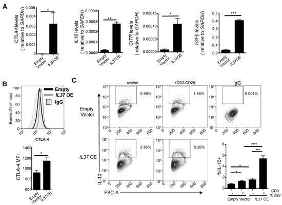 These data confirm that IL-37 overexpression in Jurkat cells induced a Treg cell phenotype. It is known that both CTLA-4 and IL-10 play a significant role in suppressing an adaptive immune response [17,18,19], suggesting that IL-37 overexpression in Jurkat cells also induces Treg functionality.