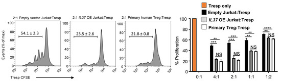 Since FOXP3 expression is integral in Treg suppressive function, we examined if IL37 OE Jurkat cells exhibited suppressive function in vitro. Freshly isolated human CD4+CD25lo T cell responder (Tresp) cells were labeled with CFSE and co-cultured in CD3-stimulatory conditions for 5 days with either control Jurkat cells or IL37 OE Jurkat cells. Human primary Treg cells were used as a positive control. We found that the co-culture of Tresp cells with IL37 OE Jurkat cells significantly suppressed the proliferation of Tresp cells (~50% reduction compared to control Jurkat cells), comparable to human primary Treg cells (Figure 4). No significant difference was found in suppressive ability between IL37 OE Jurkat cells and human primary Treg cells across all Treg/Tresp ratios.