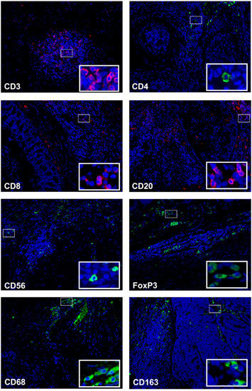 Immunofluorescence analyses revealed a heterogeneous distribution of the inflammatory cells infiltrate in FMC (n = 73). In the entire cohort, CD3+ T lymphocytes were the most common subset of immune cells, followed by B lymphocytes (CD20+), with average percentages of 17.6% and 14.4%, respectively. Infiltration by CD4+, CD8+, CD56+ and FoxP3+ TILs was identified within tumors in lower percentages, with CD8+ T lymphocytes being the most abundant of the four T cell-subsets. In parallel, approximately 32% of the tumor-associated macrophages (CD68+) showed an M2-polarized subtype (CD163+). Regarding the localization of the immune cell subpopulations, they were mainly found in the stromal compartment, with the exception of CD8+ T lymphocytes and CD68+ macrophages that were primarily found in the intratumoral compartment. The mean and median values of total, stromal and intratumoral, as well as representative images of each immune cell subtypes are depicted in Table 2 and Figure 1.