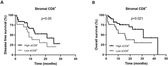 The Kaplan-Meier analysis showed that the presence of sCD8+ TILs in the TME of FMC is a prognostic factor for DFS and OS. Accordingly, cats with mammary carcinoma showing higher percentage of sCD8+ TILs in TME had longer DFS and OS, than those with lower percentages of sCD8+ TILs (21 ± 6.8 months vs. 8 ± 1.8 months, p = 0.05, Figure 2A; 31.0 ± 7.9 months vs. 15.5 ± 4.0 months, p = 0.021, Figure 2B).