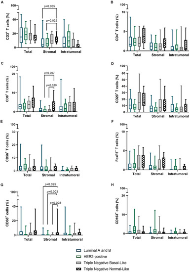 - Koletsa, T.; Kotoula, V.; Koliou, G.-A.; Manousou, K.; Chrisafi, S.; Zagouri, F.; Sotiropoulou, M.; Pentheroudakis, G.; Papoudou-Bai, A.; Christodoulou, C.; et al. Prognostic impact of stromal and intratumoral CD3, CD8 and FOXP3 in adjuvantly treated breast cancer: Do they add information over stromal tumor-infiltrating lymphocyte density? Cancer Immunol. Immunother. 2020, 69, 1549–1564. [Google Scholar] [CrossRef] [PubMed]