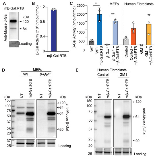 Cells treated with mβ-Gal:RTB show increased β-Gal activity and protein expression. (A) Immunoblot analyses of purified mβ-Gal:RTB probed with anti-mouse β-Gal antibody. Coomassie was used for loading control. (B) β-Gal activity of purified mβ-Gal:RTB. (C) β-Gal activity in MEFs and GM1 patients’ fibroblasts treated with mβ-Gal:RTB. n = 3. (D,E) Immunoblot analyses of MEFs (D) and human GM1 patients’ fibroblasts (E) treated with mβ-Gal:RTB and probed with anti-mouse antibody. NT = not treated. Data represents the means ± SD, * p < 0.05, ** p < 0.01.