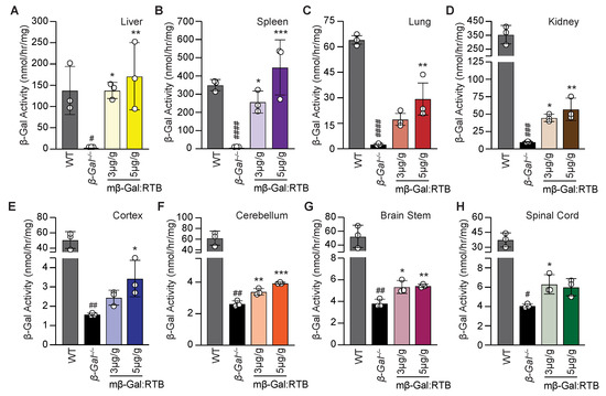 Dose-dependent treatment of β-Gal−/− mice with mβ-Gal:RTB. (A–D) β-Gal activity of β-Gal−/− mice treated with low (3 µg/g mouse) and high (5 µg/g mouse) dose mβ-Gal:RTB in the liver (A), spleen (B), lung (C), and kidney (D). n = 3. (E–H) β-Gal activity of β-Gal−/− mice treated with low (3 µg/g mouse) and high (5 µg/g mouse) dose mβ-Gal:RTB in the different CNS regions: cortex (E), cerebellum (F), brain stem (G) and spinal cord (H). n = 3. Data represents the means ± SD, * indicates significance between untreated and mβ-Gal:RTB treated β-Gal−/− mice, * p < 0.05, ** p < 0.01, *** p < 0.001. # indicates significance between WT and untreated β-Gal−/− mice, # p < 0.05, ## p < 0.01, ### p < 0.001, #### p < 0.0001.