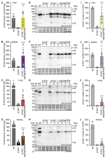 Long-term treatment with mβ-Gal:RTB shows increased β-Gal activity and protein levels in visceral organs. (A–D) β-Gal activity in liver (A), spleen (B), lung (C) and kidney (D) of β-Gal−/− mice treated with mβ-Gal:RTB for 6 weeks. n = 11. (E–L) Immunoblots analyses and corresponding quantifications of β-Gal−/− mice treated with mβ-Gal:RTB in the liver (E,I), spleen (F,J), lung (G,K) and kidney (H,L). WT: n = 3, β-Gal−/−: n = 5, β-Gal−/− + mβ-Gal:RTB: n = 11. Data represents the means ± SD, ** p < 0.01, *** p < 0.001, **** p < 0.0001.