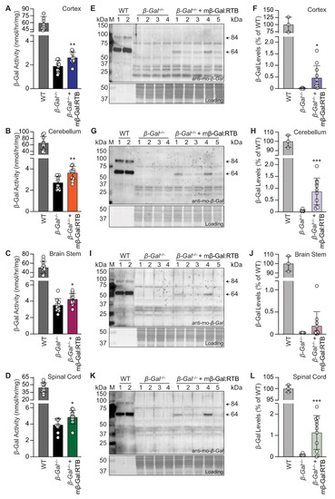 Long-term treatment with mβ-Gal:RTB shows increased β-Gal activity and protein levels in the CNS. (A–D) β-Gal activity in cortex (A), cerebellum (B), brain stem (C) and spinal cord (D) of β-Gal−/− mice treated with mβ-Gal:RTB for 6 weeks. n = 11. (E–L) Immunoblots analyses and corresponding quantifications of β-Gal−/− mice treated with mβ-Gal:RTB in the cortex (E,F), cerebellum (G,H), brain stem (I,J) and spinal cord (K,L). WT: n = 3, β-Gal−/−: n = 5, β-Gal−/− + mβ-Gal:RTB: n = 11. Data represents the means ± SD, * p < 0.05, ** p < 0.01, *** p < 0.001.