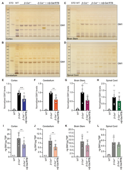 mβ-Gal:RTB treated mice show reduction of GM1 in the CNS. (A–D) HPTLC analyses of GM1 levels in the CNS regions of WT, β-Gal−/− and treated mice. STD: GM1 standard (1 µg). (E–H) Quantification of GM1 levels in A. n = 11 (I–L) Quantification of GM1 levels measured by ELISA in the cortex (I), cerebellum (J), brain stem (K), and spinal cord (L). WT: n = 3, β-Gal−/−: n = 6, β-Gal−/− + mβ-Gal:RTB: n = 11. Data represents the means ± SD, * p < 0.05, ** p < 0.01, *** p < 0.001.
