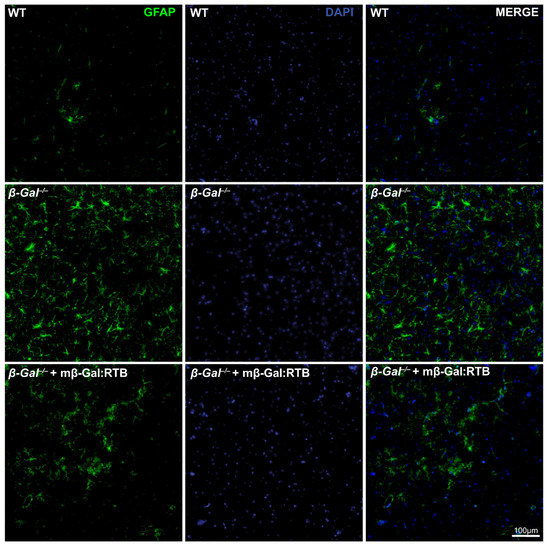 Reduced astrogliosis in mβ-Gal:RTB treated β-Gal−/− mice. IF staining of astrocytes in the thalamic region of WT, β-Gal−/− and mβ-Gal:RTB injected β-Gal−/− mice using anti-GFAP antibody. Scale bar: 100 µm.