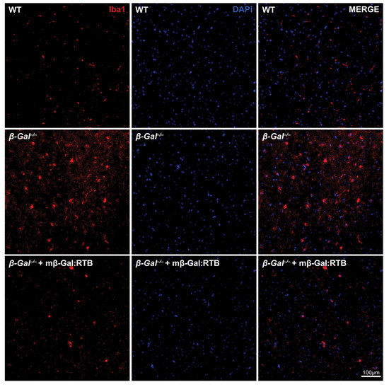 Reduced microgliosis in mβ-Gal:RTB treated β-Gal−/− mice. IF staining of microglia in the thalamic region of WT, β-Gal−/− and mβ-Gal:RTB injected β-Gal−/− mice using anti-Iba1 antibody. Scale bar: 100 µm.