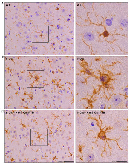 Neuronal apoptosis in the β-Gal−/− mice is known to elicit a neuroinflammatory response characterized by prominent astrogliosis and microgliosis [31]. Brains from mβ-Gal:RTB-injected and non-injected mice were stained with glial fibrillary acidic protein (GFAP), a marker of astrocytes, and ionized Ca2+ binding adaptor molecule 1 (Iba1), a marker of reactive microglia. The injected mice showed a significant reduction in the number of reactive astrocytes and microglia throughout the entire brain, including the thalamus (Figure 8 and Figure 9). Quantification of microgliosis and astrogliosis in mβ-Gal:RTB-injected mice showed a statistically significant 3.6-fold reduction of Iba1-positive microglia and a 4.3-fold reduction of GFAP-positive astrocytes (Supplemental Figure S9A,B). Furthermore, mβ-Gal:RTB treatment resulted in changes in the size and shape of microglia, which are parameters indicative of their activated status (Figure 10A–C and Supplemental Figure S9A–C). Untreated β-Gal−/− mice showed reactive, activated, amoeboid microglia with retracted processes and small branching, while mβ-Gal:RTB-injected mice showed normalized, ramified microglia with extensive branching similar to those seen in control WT brains (Figure 10A,B and Supplemental Figure S9A–C). Taken together, these results reiterate that the chosen dose of mβ-Gal:RTB was sufficient to revert significant phenotypic alterations downstream of GM1 accumulation in the brain.