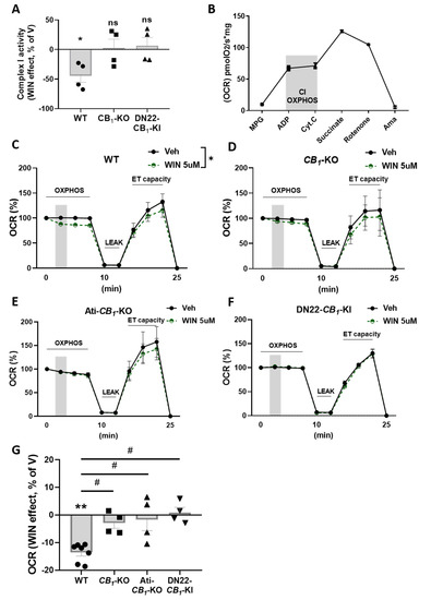 Mitochondrial effects of CB1 activation in eWAT. (A) WIN 5 µM effect (relative to vehicle, V) on complex I activity in eWAT from WT, CB1-KO, and DN22-CB1-KI mice. (B) Oxygen consumption rate (OCR) in eWAT homogenates from WT mice. MPG, malate pyruvate glutamate; ADP, adenosine di-phosphate; Cyt.C, cytochrome C; Ama, antimycin A. The gray area indicates complex-I-dependent respiration (OXPHOS) used for testing cannabinoid agonist effects. (C–F) Time course of the WIN effect on the oxygen consumption rate (OCR) in eWAT homogenates from WT (C), CB1-KO (D), Ati-CB1-KO (E), and DN22-CB1-KI (F) mice. The OXPHOS phase represents complex-I-dependent respiration (see B); LEAK, oligomycin-dependent ATP synthase inhibition; ETS, electron-transfer-system in an uncoupled state (by the addition of carbonyl cyanide m-chlorophenylhydrazone). The grey area indicates WIN (or vehicle) administration. (G) The WIN effect (relative to vehicle, V) on complex-I-dependent OXPHOS respiration in eWAT homogenates from WT, CB1-KO, Ati-CB1-KO, and DN22-CB1-KI mice calculated from panels (C–F), respectively. ** p < 0.01 from vehicle. # p < 0.05 from WT.