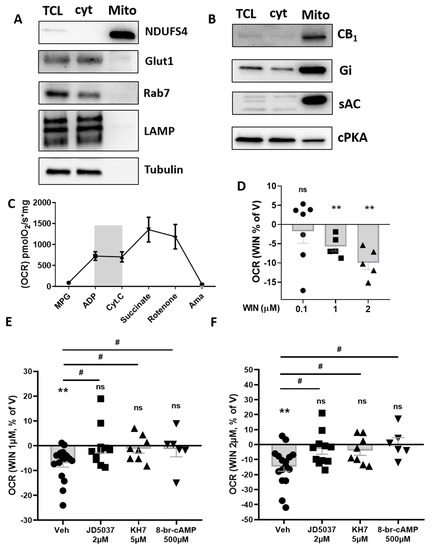 Effect of CB1 stimulation and the relative intramitochondrial pathway involved in isolated eWAT mitochondria. (A) Western blotting of isolated mitochondria extracts (mito) from rat eWAT compared to total cell lysate (TCL) and cytoplasmic (cyt) fraction. Membranes were incubated with antibodies against NADH:ubiquinone oxidoreductase subunit S4 (NDUFS4, mitochondrial marker), glucose tansporter-1 (Glut1, plasma membrane marker), Ras-related protein Rab-7a (Rab7, endosomes marker), lysosomal-associated membrane protein-2 (LAMP, lysosomes marker), and tubulin (cytoplasm marker). (B) Western blotting of isolated mitochondria extracts (mito) from rat eWAT compared to total cell lysate (TCL) and cytoplasmic (cyt) fraction. Membranes were incubated with antibodies against CB1 receptor, Gi protein, sAC (soluble adenylyl cyclase), and cPKA (catalytic subunit of protein kinase A). (C) Oxygen consumption rate (OCR) in isolated mitochondria from rat eWAT. MPG, malate pyruvate glutamate; ADP, adenosine di-phosphate; Cyt.C, cytochrome C; Ama, antimycin A. The gray area indicates complex-I-dependent respiration (OXPHOS) used for testing cannabinoid agonist effects. (D) Dose-dependent effect of WIN (relative to vehicle, V) on complex-I-dependent OXPHOS respiration in isolated mitochondria from rat eWAT. (E,F) Effect of WIN 1 µM (E) or 2 µM (F) (mean of 3 time points, expressed as a percentage of V) on complex-I-dependent OXPHOS respiration in isolated mitochondria from rat eWAT pretreated with control vehicle, 2 µM CB1 antagonist JD5037, 5 µM sAC blocker KH7, and 500 µM PKA activator 8-br-cAMP. * p < 0.05; ** p < 0.01 from vehicle. # p < 0.05 from Veh pre-treatment.