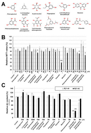 Screening for low molecular weight and commercially available phloroglucinol derivatives decreasing Aβ levels. (A) Chemical structures of the phloroglucinol derivatives screened in the present study. (B) MTT reduction assay analysis after treatment of 293sw cells with different doses of the compounds for 8 h. The column color indicates the low (light gray), medium (gray), and high (black) doses of each individual compound. The concentration range for each compound was determined through 3-4 independent repeated measurement. (C) ELISA analysis of Aβ1–40 and Aβ1–42 levels in the culture medium of 293sw cells treated with the indicated doses of compounds for 8 h. Values in panels B and C are presented as means ± SEMs (n = 3). Statistical significance of the differences between treated cells and untreated controls were determined using Student’s t-test (* p < 0.05, ** p < 0.01).