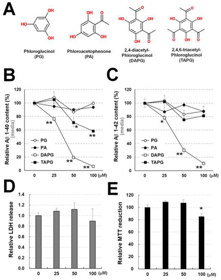 Since DAPG and TAPG are acetylphloroglucinols reducing secreted Aβ amounts in the medium, we compared the effects of various doses (0–100 μM) of phloroglucinol and acetylphloroglucinols (Figure 2A). Phloroglucinol and phloroacetophenone did not affect Aβ1–40 and Aβ1–42 levels measured by ELISA (Figure 2B,C). TAPG concentrations of 50 μM or higher decreased Aβ1–40, but not Aβ1–42, levels. All tested DAPG concentrations reduced Aβ1–40 and Aβ1–42 amounts secreted into the medium without affecting LDH release (Figure 2D). MTT reduction was decreased by 100 μM DAPG (Figure 2E), indicating a growth arrest rather than cell death.