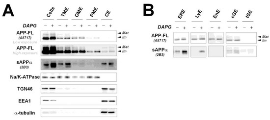 It has been reported that α-secretase is mainly located in the plasma membrane and β- and γ-secretases are activated in intracellular organelles such as the endosome and Golgi complex [21,22]. Because our data revealed that DAPG increased intracellular and extracellular sAPPα levels, we examined the cellular localization of sAPPα regulated by DAPG by isolating intracellular organelle- and plasma membrane-enriched fractions (Figure 4A). DAPG did not significantly change the levels of full-length APP (APP-FL) in TME, organelle membrane-enriched (OME), and CE fractions compared with those measured in untreated controls. In contrast, sAPPα levels were increased by DAPG in TME, OME, and CE fractions, indicating that intracellular sAPPα production or accumulation occurred in the lumen of intracellular organelles or vesicular structures that are connected with the extracellular space rather than in the cytosol. We detected sAPPα in the CE fraction, although this fraction does not usually contain sAPPα. This was likely due to the presence in the CE fraction of small vesicles including structures positive for TGN46 and EEA1, which are markers of the trans-Golgi network (TGN) and early endosome, respectively, in which sAPPα levels were strongly increased by DAPG. Therefore, we further examined sAPPα levels in isolated intracellular organelles (Figure 4B).