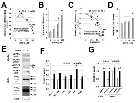 Examination of DAPG-mediated decrease in Aβ levels and toxicity in primary neurons and astrocytes from APPsw/PS1dE9 transgenic mice. (A,B) ELISA analysis of Aβ1–40 and Aβ1–42 levels (A) and LDH release analysis (B) in the culture medium from primary neurons isolated from APPsw/PS1dE9 transgenic mice. Neurons were treated with 0–100 μM DAPG for 8 h. (C) ELISA analysis of Aβ1–40 and Aβ1–42 levels (C) and LDH release analysis (D) in the culture medium from primary astrocytes isolated from the transgenic mice. Astrocytes were treated with 0–100 μM DAPG for 8 h. (E) Immunoblots analysis of APP processing in primary astrocytes and culture medium after 8 h treatment with 30 μM DAPG. The levels of sAPPα and sAPPs in the medium and immature (Im) and mature (Mat) APP-FL, sAPPα, CTFs, AICD, and actin in cells were examined. (F,G) Densitometry analysis of markers in primary astrocytes (F) and sAPPs in the cells and medium (G) from immunoblots presented in (E). Values in all graphs are presented as means ± SEMs (n = 3). Statistical significances of the differences between treated groups and untreated controls were determined using Student’s t-test (* p < 0.05, ** p < 0.01).