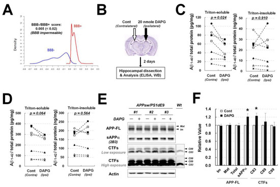 Examination of DAPG effects on Aβ levels and APP processing after DAPG intrahippocampal injection. (A) Computational prediction of blood–brain barrier permeability to DAPG using online prediction software available at http://www.cbligand.org/BBB, accessed on 26 July 2022. (B) Schematic illustration of DAPG intrahippocampal injection and further analyses, including immunoblot and Aβ ELISA assays, in 8-month-old APPsw/PS1dE9 transgenic mice. Detailed methods for DAPG injection and Aβ analysis are described in Materials and Methods. (C,D) ELISA analysis of Aβ1–40 (C) and Aβ1–42 (D) levels obtained in Triton-soluble and Triton-insoluble (or GuHCl-soluble) fractions from control and DAPG-injected hippocampi. In the graph, the values obtained for control (contralateral) and DAPG-injected (ipsilateral) hippocampi were statistically paired. Paired t-tests were used to determine the statistical significance of the differences (n = 7) and the resultant p-values are plotted on the graph. (D,E) Immunoblot analysis of APP processing (E) in control and DAPG-injected hippocampi from the transgenic mice and densitometry analysis of the immunoblots (F). Values in (F) are presented as means ± SEMs (n = 7). Statistical significances of difference between the injected and uninjected groups were determined using paired t-test (* p < 0.05).