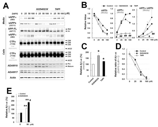 Examination of the effects of ADAM10 and ADAM17 inhibitors on DAPG-mediated decrease in Aβ levels and changes in APP processing in 293sw cells. (A) Immunoblot analysis of APP processing and expression of ADAM10 and ADAM17 in 293sw cells co-treated with 0–100 μM DAPG and 10 μM GI243023X (an ADAM10 inhibitor) or 10 μM TAPI (an ADAM17 inhibitor) for 8 h. (B) Densitometry analyses of the immunoblots from (A) for sAPPα and sAPPs levels in the culture medium and the ratio of sAPPα to sAPPs levels. Values are presented as means ± SEMs (n = 3). Statistical significances of the differences between DAPG-treated group and both DAPG- and GI254023X-treated group (# p < 0.05, ## p < 0.01) were determined using one-way ANOVA followed by Tukey’s test. (C) ELISA analysis of Aβ1–40 levels in the medium of 293sw cells treated with GI254023X or TAPI for 8 h. Values are presented as means ± SEMs (n = 3). Statistical significances of the differences between treated groups and untreated controls were determined using Student’s t-test (* p < 0.05). (D) Relative ratio of Aβ1–40 in the medium of 293sw cells compared with DAPG-untreated group determined by ELISA analysis after treatment with 0–100 μM DAPG with or without GI254023X and TAPI for 8 h. (E) ELISA analysis of intracellular Aβ1–40 levels after treatment of 293sw cells with 50 μM DAPG in presence or absence of GI254023X for 8 h. Values are presented as means ± SEMs (n = 3). Statistical significances of the differences between DAPG-untreated group and DAPG-treated group (** p < 0.01) or between DAPG-treated group and both DAPG- and GI254023X-treated group (# p < 0.05) were determined using one-way ANOVA followed by Tukey’s test.