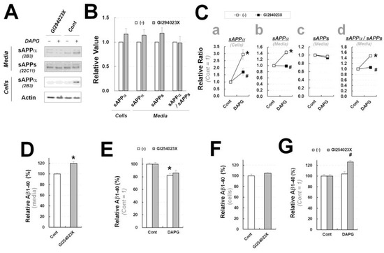 Examination of ADAM10 inhibitor effects on DAPG-mediated decrease in Aβ and increase in sAPPα levels in primary astrocytes from APPsw/PS1dE9 transgenic mice. (A) Immunoblot analysis of sAPPα and sAPPs levels in primary astrocytes treated with 10 μM GI243023X (ADAM10 inhibitor) and 30 μM DAPG for 8 h. (B,C) Densitometry analysis of sAPPα and sAPPs levels in the medium or cells from the immunoblots presented in (A). Panel B shows the effects of GI294023X alone. Panel C shows the relative ratio between controls and cells treated with DAPG or DAPG and GI294023X. The values of sAPPα levels in cells (a) and the medium (b), sAPPs levels in the medium (c), and the ratio of sAPPα to sAPPs levels in the medium (d) are represented. (D) ELISA analysis of Aβ1–40 amounts in the culture medium from primary astrocytes treated with GI294023X for 8 h. (E) Relative Aβ1–40 content in the culture medium from primary astrocytes treated with 30 μM DAPG with or without 10 μM GI294023X for 8 h measured by ELISA (F,G) ELISA analysis of intracellular Aβ1–40 levels in primary astrocytes treated with GI294023X alone (F) or GI294023X with DAPG (G). Statistical significances of differences between treated groups and untreated controls were determined using Student’s t-test in panels D and E (* p < 0.05). In panels C and G, differences between untreated and DAPG-treated groups (* p < 0.05) or between DAPG-treated and both DAPG- and GI254023X-treated group (# p < 0.05) were analyzed using one-way ANOVA followed by Tukey’s test.