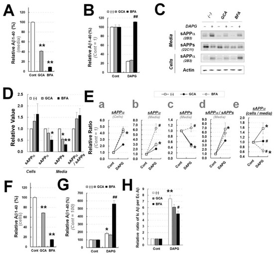 Examination of GCA and BFA effects in 293sw cells on DAPG-mediated Aβ levels decrease and sAPPα levels increase. (A) ELISA analysis of Aβ1–40 amounts in the culture medium of 293sw cells treated with 3.5 μM GCA or 60 ng/mL BFA for 8 h. (B) Relative Aβ1–40 content in the culture medium of 293sw cells treated with 50 μM DAPG with or without 3.5 μM GCA or 60 ng/mL BFA for 8 h analyzed by ELISA. (C) Immunoblot analysis of sAPPα and sAPPs levels in 293sw cells treated with DAPG and GCA or BFA for 8 h. (D,E) Densitometry analysis of sAPPα and sAPPs levels in the medium or cells from immunoblots presented in (C). Panel D represents the effects of GCA or BFA alone. Panel E shows the relative ratio between controls and cells treated with DAPG alone (untreated) or with DAPG and GCA or BFA. The values of sAPPα levels in cells (a) and the medium (b) and sAPPs levels in the medium (c) as well as the ratios of sAPPα to sAPPs levels in the medium (d) and of sAPPα levels in cells to the levels in the medium (e) are presented. (F,G) ELISA analysis of intracellular Aβ1–40 levels in 293sw cells treated with GCA or BFA (F) or DAPG and GCA or BFA (G). (H) Ratios of Aβ1–40 levels in cells treated with DAPG and GCA or BFA (Ic Aβ) to the levels in their culture medium (Ec Aβ). All values in graphs are presented as means ± SEMs (n = 3). Statistical significances of differences between untreated and DAPG-treated groups (* p < 0.05, ** p < 0.01) or between DAPG–treated and DAPG- and GCA- or BFA-treated groups (# p < 0.05, ## p < 0.01) were analyzed. In panels (A,D,F), Student’s t-test was used (* p < 0.05, ** p < 0.01), whereas one-way ANOVA followed by Tukey’s test was performed in panels (B,E,G,H).