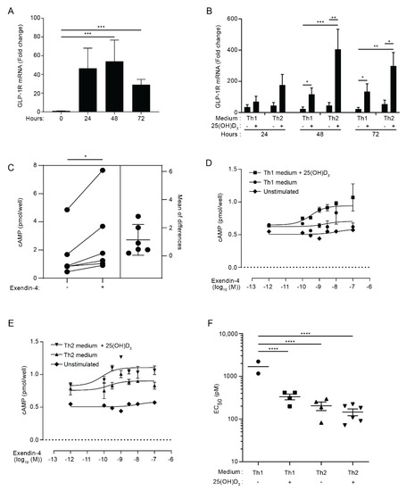 Activated CD4+ T cells express functional GLP-1R. (A) Relative GLP-1R expression in naïve CD4+ T cells (0 h) or CD4+ T cells activated for 24, 48, or 72 h. Data are normalized to GLP-1R expression in naïve CD4+ T cells (0 h) (mean + SEM, n = 6, one-way ANOVA with post-hoc test (Tukey’s), *** p ≤ 0.0005). (B) Relative GLP-1R expression in CD4+ T cells activated for 24, 48, or 72 h in Th1 or Th2 polarizing medium in the absence or presence of 100 nM 25(OH)D3 as indicated. Data are normalized to GLP-1R expression in naïve CD4+ T cells (mean + SEM, n ≥ 6, one-way ANOVA with post-hoc test (Tukey’s) for each time group, * p < 0.05, ** p < 0.005, *** p < 0.0005). (C) cAMP in CD4+ T cells activated for 60 h in Th2 polarizing medium plus 25(OH)D3 (100 nM) and subsequently not treated or treated with exendin-4 (10 nM) for 30 min as indicated (estimation plot, n = 6, Student’s t-test, (paired, two-tailed), * p < 0.05). (D,E) cAMP accumulation in CD4+ T cells activated for 60 h in (D) Th1 or (E) Th2 medium in the absence or presence of 100 nM 25(OH)D3 and treated with increasing amounts of exendin-4 as indicated. Naïve, unstimulated CD4+ T cells were included as controls. Representative graphs from three independent experiments with six donors run in duplicates (mean ± SEM). (F) EC50 values from the nonlinear fits (mean ± SEM, n ≥ 4, one-way ANOVA with post-hoc test (Tukey’s), **** p < 0.00005).