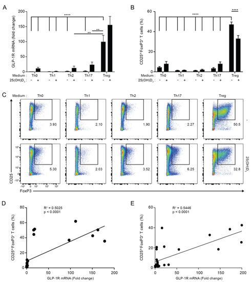 GLP-1R expression directly correlates with the percentage of CD25+FoxP3+ T cells. (A) Relative GLP-1R expression, (B) percentage of CD25+FoxP3+ T cells and (C) representative flow cytometric analysis of CD4+ T cells activated for 120 h in the indicated polarization medium in the absence or presence of 25(OH)D3 (100 nM). GLP-1R expression was normalized to GLP-1R expression in CD4+ T cells activated for 120 h in Th0 medium in the absence of 25(OH)D3 (mean + SEM, n ≥ 4, one-way ANOVA with post-hoc test (Dunnett’s), ** p < 0.005, **** p < 0.00005. The mean of each column was compared with the mean of the column for Treg minus vitamin D). Data presented in (B,C) were obtained by gating on live, single lymphocytes as shown in Figure S2. The percentage of CD25hiFoxP3+CD4+ T cells correlated with the expression level of the GLP-1R in CD4+ T cells activated for 120 h in the indicated differentiation media in both the absence (D) and presence (E) of 25(OH)D3 (100 nM) as determined by linear regression analysis.