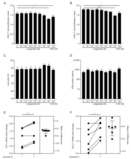 Previous studies have indicated that GLP-1RA inhibits the proliferation and cytokine production of T cells in mice [45] and the IFNγ production of activated human PBMC [23]. In an attempt to identify the functional roles of GLP-1R signaling in T cells in addition to the increase in cAMP, we activated PBMC from healthy donors with anti-CD3 mAb in the absence or presence of increasing concentrations of the GLP-1RA liraglutide for 5 days and measured proliferation indexes, live cells and IFNγ production. As a control, we included the general cAMP inducer forskolin. We found that liraglutide inhibited proliferation of both CD4+ and CD8+ T cells without affecting the viability of the cells or the production of IFNγ (Figure 5A–D and Figure S5). These experiments did not allow us to conclude whether GLP-1RA have a direct anti-proliferative effect on GLP-1R-expressing CD4+ and CD8+ T cells or whether the effect was mediated via iTreg cells, but they supported that GLP-1RA affect T cell responses. To investigate whether GLP-1RA have a direct effect on iTreg cells, we activated naïve CD4+ T cells for five days in Treg cell-polarizing medium. Subsequently, the cells were washed and activated in non-supplemented medium in the absence or presence of exendin-4. After 24 h, selected gene expression levels were measured by RT-qPCR. Interestingly, we found that exendin-4 significantly increased the expression levels of programmed death 1 (PD-1) and programmed death-ligand 1 (PD-L1) (Figure 5E,F), whereas it did not affect expression of TGFβ, CD25 or FoxP3 (Figure S6).
