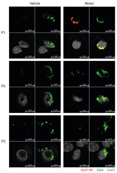 GLP-1R+CD4+ T cells are found in the skin. First quadrant GLP-1R (red), second quadrant CD4 (green), third quadrant DAPI (grey) and fourth quadrant merged stained fluorescent microscopy images of vehicle-exposed (Vehicle) and nickel-exposed (Nickel) skin from patients with allergic contact dermatitis to nickel. Representative images from three patients (P1, P2, P3).
