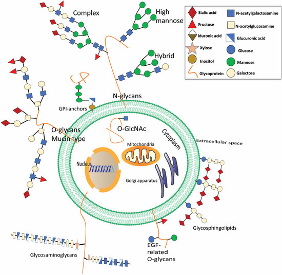 Glycans are the most common and diverse biopolymers in nature, attaching to proteins or lipids through glycosylation to generate glycoproteins and glycolipids, respectively, and are one of the four essential components of plant and animal cells. According to the linkage between glycans and the protein core regions, N-glycans, O-glycans, glycosaminoglycans, and glycosphingolipids are the four categories of distinguishable glycans [8,9]. Glycans are involved in biological processes that occur in the tumor, for example, cell-cell signaling and communication, cancer cell metastasis and invasion, angiogenesis of the tumor, and immunological regulation [10].