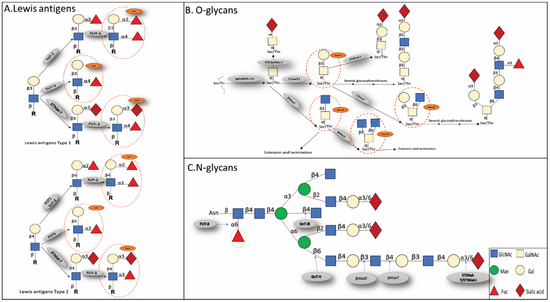 - Carvalho, A.S.; Harduin-Lepers, A.; Magalhães, A.; Machado, E.; Mendes, N.; Costa, L.T.; Matthiesen, R.; Almeida, R.; Costa, J.; Reis, C.A. Differential expression of alpha-2,3-sialyltransferases and alpha-1,3/4-fucosyltransferases regulates the levels of sialyl Lewis a and sialyl Lewis x in gastrointestinal carcinoma cells. Int. J. Biochem. Cell Biol. 2010, 42, 80–89. [Google Scholar] [CrossRef] [PubMed]