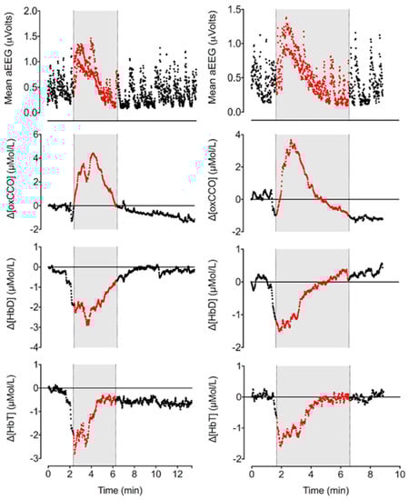 Changes in cerebral metabolism (oxCCO), oxygen delivery (HbD) and blood volume (CBV) during seizures in an infant with HIE (left = seizure 4 of 5, right = seizure 5 of 5). Seizure periods were identified on raw EEG and are marked here in grey [46] (reproduced with permission under the Creative Commons Attribution 4.0 International License (http://creativecommons.org/licenses/by/4.0/, accessed on 26 June 2022).