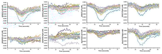 In the post-ictal period, a slow return towards baseline HbO2, HHb, HbT and HbD values was observed in all studies [43,46,80,82]. Two studies [46,74] demonstrated the occurrence of repetitive, transient oscillatory haemodynamic and metabolic changes with different NIRS devices (Figure 3). The electrical activity on EEG was suppressed during these periods. Transient changes exhibited a rapid decrease to a minimum and a slow recovery to baseline in optical markers and were more significant on the injured side [46]. A clear hemispheric difference was noted in cases of perinatal strokes in both studies. These changes were noted over an average duration of 90 s. No corresponding systemic changes were observed during these episodes. The aetiology of these events was unclear.