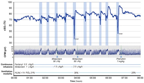 Changes in rSO2 and electrical activity on cerebral function monitoring (CFM) trace during seizures (highlighted by blue bars). SIPPV + VG is the ventilatory mode, synchronized intermittent positive pressure ventilation with volume guarantee [75]. Copyright (2019) by (Georg Thieme Verlag KG Stuttgart). Reproduced with permission of (Georg Thieme Verlag KG Stuttgart) in the format of (Journal/Magazine/Newspaper) via Copyright Clearance Center. Permission remains with (Georg Thieme Verlag KG Stuttgart). Any reuse of this image must be requested from the publisher directly.
