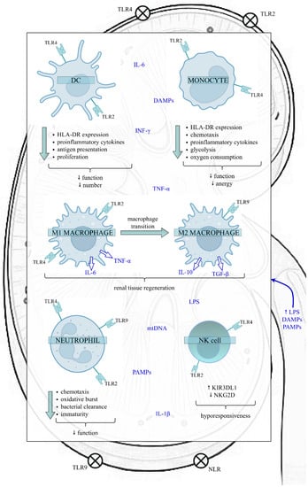 The impact of sepsis on the function of the innate immune cells in the kidney. Sepsis exposes the kidney to a proinflammatory microenvironment, which impairs various kidney structures, like RTECs, Bowman’s capsular epithelium, and glomerular and endothelial cells. In the initial phase of sepsis, LPS, PAMPs and DAMPs bind to TLRs and NLRs present on the surface of both kidney and innate immune cells, initiating a downstream cascade of signals that results in the synthesis and release of proinflammatory cytokines. However, as sepsis continues, the innate immune response is altered. The above alterations include the reduced function and number of DCs, diminished function and anergy of monocytes, the transition of M1 proinflammatory to M2 anti-inflammatory macrophages, increased proportion of immature neutrophils with a weakened role and a higher proportion of NK cells expressing the inhibitory receptor KIR3DL1. Nevertheless, data on the effects of sepsis on NK cells are insufficient. In contrast, the expression of activating membrane receptor NKG2D decreases, predisposing cells to hyporesponsiveness. Disturbances of innate immunity favour immunosuppression and can have harmful clinical consequences, such as increased susceptibility to secondary infections and viral reactivations, leading to increased mortality. Abbreviations: DC—dendritic cell; NK—natural killer; HLA-DR—human leukocyte antygen-DR; TLR—Toll-like receptor; NLR—NOD-like receptor; LPS—lipopolysaccharide; PAMPs—pathogen-associated molecular patterns; DAMPs—damage-associated molecular patterns; TNF-α—tumour necrosis factor alpha; IL-6—interleukin 6; IL-1β—interleukin 1 beta; IL-10—interleukin 10; TGF-β—transforming growth factor-beta; INF-ɣ—interferon gamma; mtDNA—mitochondrial DNA; KIR3DL1—Killer cell immunoglobulin-like receptor; NKG2D—NK group 2 member D receptor.