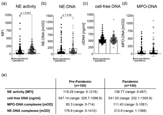 To assess changes in the formation of NETs between the serum samples taken pre-pandemic and during the pandemic, we analyzed the activity of the NE, the amount of cell-free DNA, and the presence of NE-DNA and MPO-DNA complexes. Compared to the pre-pandemic serum samples, only the activity of NE and the presence of NE-DNA complexes were significantly different in the pandemic samples (Figure 1a,b,e). No statistical difference was observed in the amount of cell-free DNA (Figure 1c) and the presence of MPO-DNA complexes (Figure 1d), even though there was a trend towards higher amounts of MPO-DNA complexes in the pandemic samples (Figure 1e).