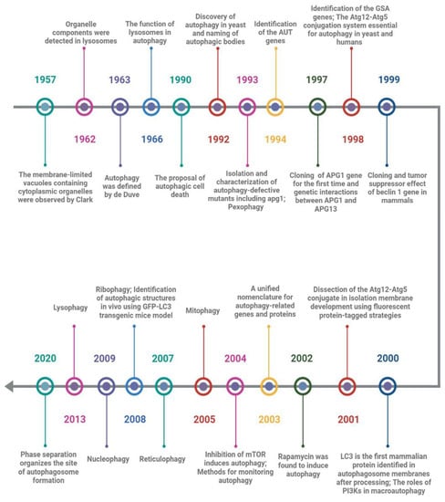 Timeline of historical events in autophagy. This timeline depicts the key discoveries of autophagy. Unfortunately, it is not possible to include all discoveries due to limited space.