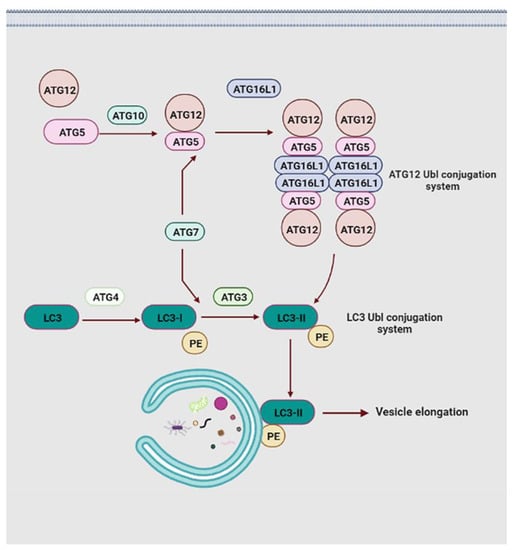 Elongation of the phagophores membrane is main mediated by two ubiquitin-like (Ubl) conjugation systems, namely the microtubule-associated protein 1A/1B-light chain (LC3) Ubl conjugation and the ATG12 Ubl conjugation (Figure 5) [98]. Initially, under the effects of the E1-like ubiquitin ligase ATG7 and E2-like ubiquitin ligase ATG10, the carboxy-terminal Ubl structure of Ubl protein ATG12 conjugates to the lysine of the ATG5, forming the ATG12-ATG5 conjugate [99]. This conjugate increases the affinity for ATG16L1, which safeguards the ATG12-ATG5 complex against ubiquitin-like modification and protease degradation by binding to free ATG5, promoting the complicated assembly of the ATG12-ATG5-ATG16L1 system [100]. In this system, ATG16L1 plays the role of dimerization protein through binding to two ATG12-ATG5 conjugates and constitutes ATG12-ATG5-ATG16L1 homodimers [101]. ATG12 is one of two Ubl proteins in autophagy and it directs the ATG12 Ubl conjugation system to the outer membrane of the phagophores by an auxiliary connection [98]. Moreover, two hydrophobic residues in the ATG12 ubiquitin-fold region are necessary for the ATG12 Ubl conjugation system. The mutation at Y149 reduces the catalytic capability of ATG10 and severely impedes the conjugate formation of the ATG12-ATG5 complex, which is not affected by the F154 mutation [102]. In response to the mutation at F154, the LC3 II-phosphatidylethanolamine (PE) conjugation is significantly stopped, failing vesicle elongation [103].