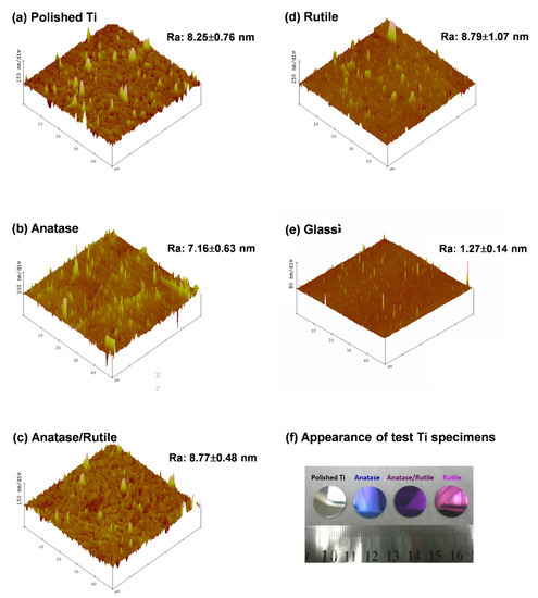 Surface topography of the test specimens, analysed via AFM: (a) T group (non-crystalline polished Ti surface), (b) A group (TiO2 anatase phase), (c) R group (TiO2 rutile phase), (d) AR group (mixed anatase/rutile phase), (e) G group (silica glass); (f) visual appearance of test Ti specimens. All test Ti groups (T, A, AR, and R) showed similar and small surface roughness values (Ra—8 nm) and mirror-like surfaces.