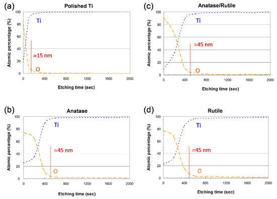 XPS depth profile analysis, in terms of Ti and O elements, of TiO2 thickness on different Ti specimens. The thickness of the oxide layer on surface-modified Ti specimens was roughly 45 nm, approximately 3 times than that of unmodified polished Ti specimens.